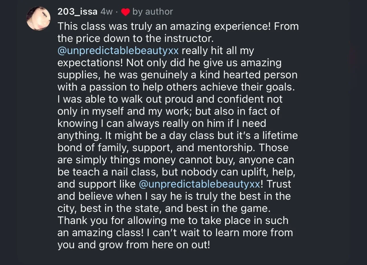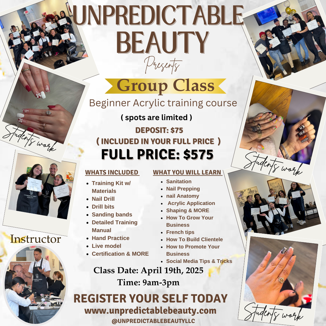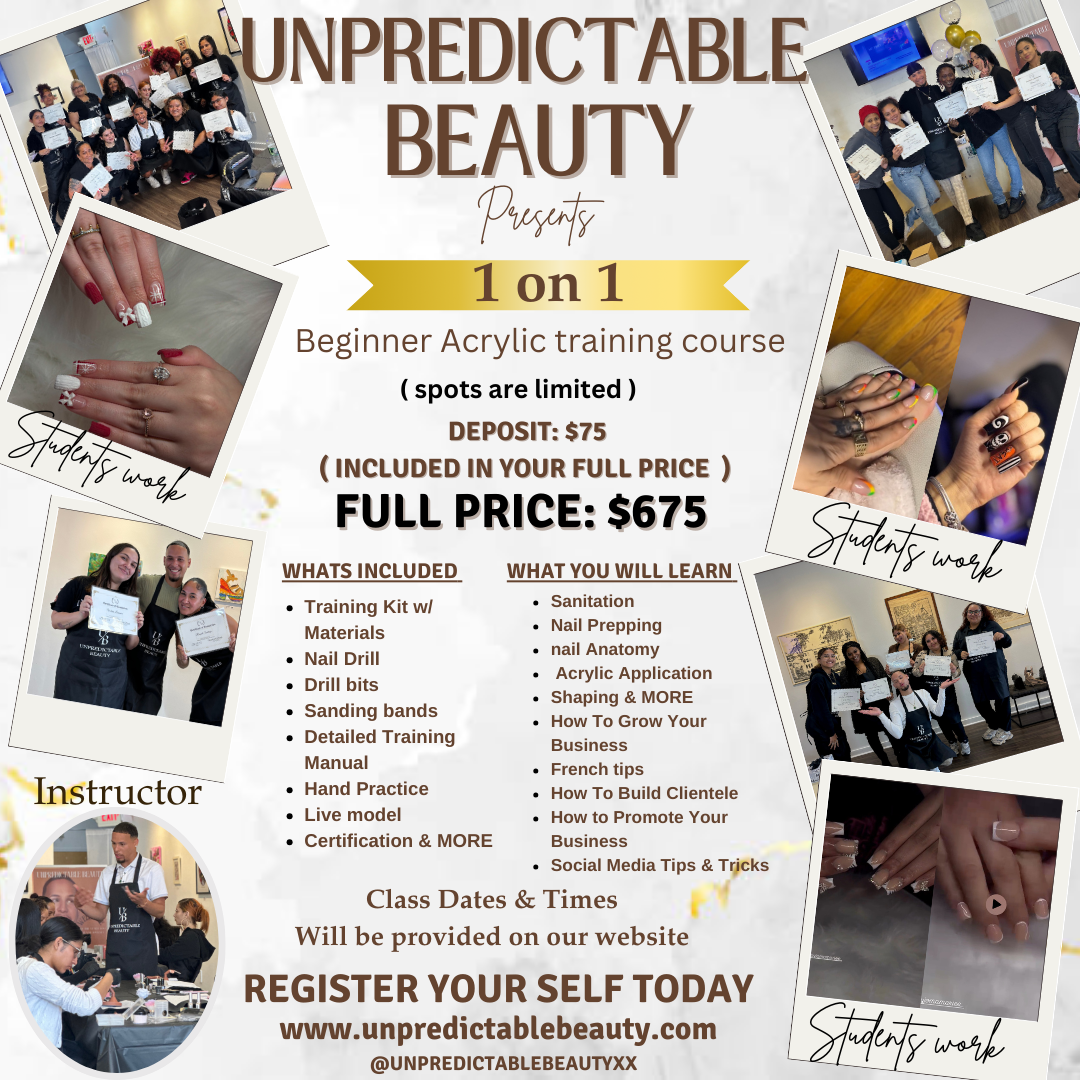 Unpredictable Beauty redefines beginner acrylic nail training and certifications with in person group training classes, 1 on 1 classes and Virtual classes to help you transform your life into becoming your own boss. Products & Services are available as well.